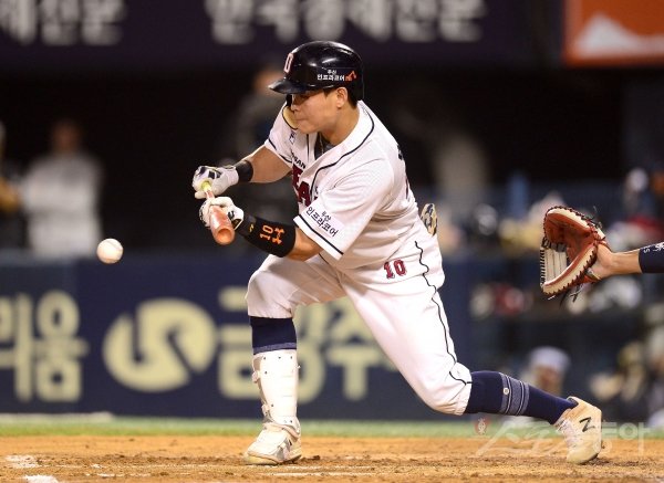 2회말 무사 1루 두산 박세혁이 보내기 번트를 하고 있다.