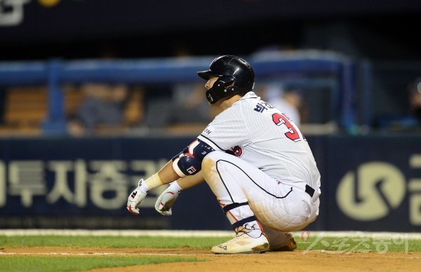 7회말 1사 2루 두산 박건우가 유격수 직선타로 아웃된 후 아쉬워하고 있다.