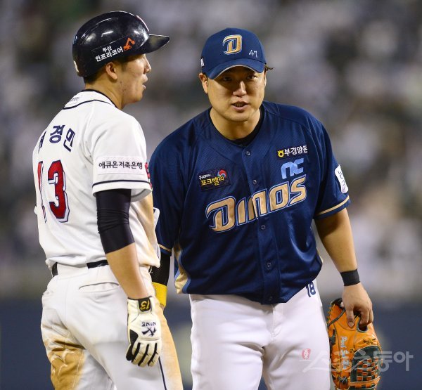 7회말 무사 1,3루 NC 박석민이 3루주자 허경민과 이야기하고 있다.