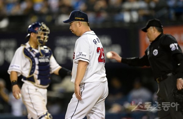 1일 서울 잠실야구장에서 ‘2019 신한은행 MY CAR KBO리그’ NC 다이노스와 두산 베어스 경기가 열렸다. 8회초 1사 2루 두산 유희관이 안타를 허용해 실점한 후 아쉬워하고 있다.