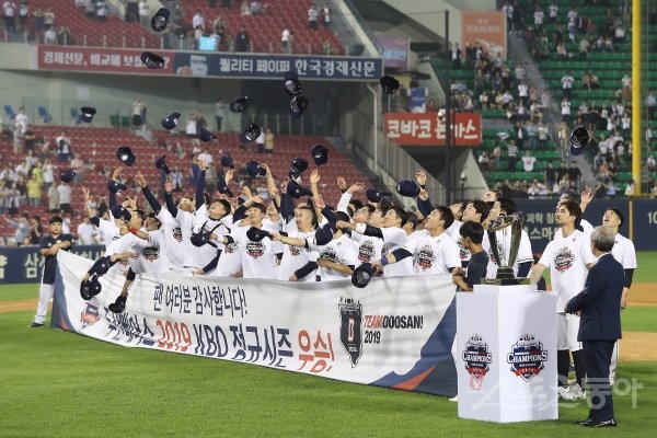 1일 서울 잠실야구장에서 열린 ‘2019 신한은행 MY CAR KBO리그’ NC 다이노스와 두산 베어스의 경기에서 9회말 터진 박세혁의 끝내기 안타를 앞세운 두산이 6-5로 승리하며 극적인 정규시즌 우승을 차지했다. 경기 후 두산 선수들이 모자를 던지는 세리머니를 펼치고 있다.