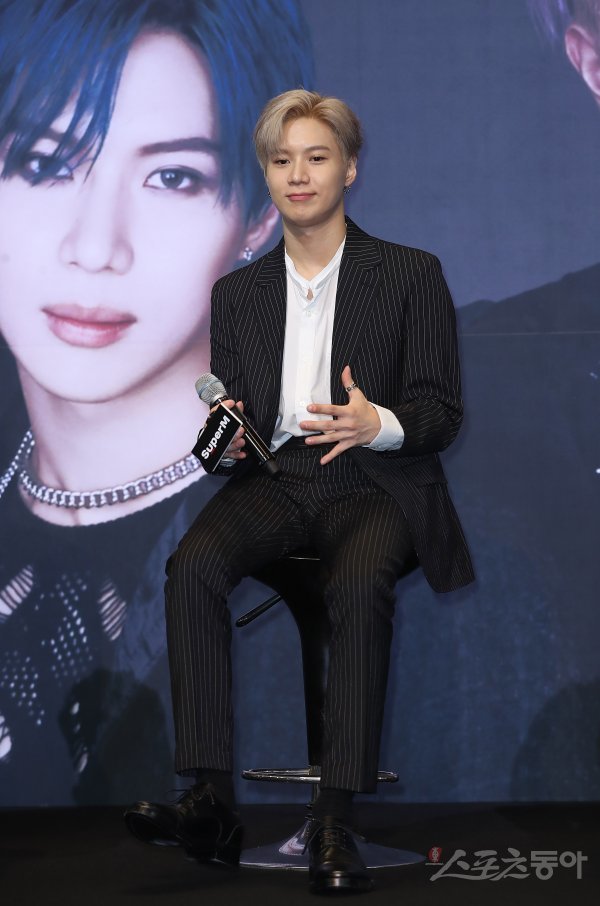 슈퍼엠(SuperM)의 태민이 2일 서울 용산 드래곤시티 그랜드볼룸 백두홀에서 열린 월드와이드 론칭 기념 기자간담회에서 타이틀 곡 Jopping(쟈핑)이 나오자 리듬을 타고 있다.