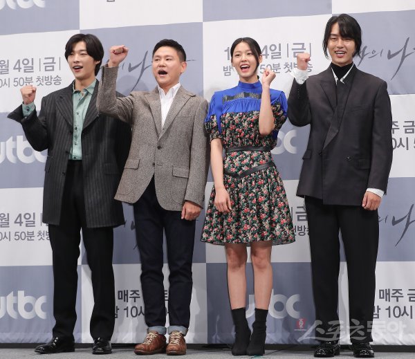 배우 우도환과 김진원 PD, 김설현, 양세종(왼쪽부터)이 2일 서울시 강남구 임피리얼 팰리스 서울에서 열린 JTBC 새 금토드라마 ‘나의 나라’ 제작발표회에 참석해 포토타임을 갖고 있다.