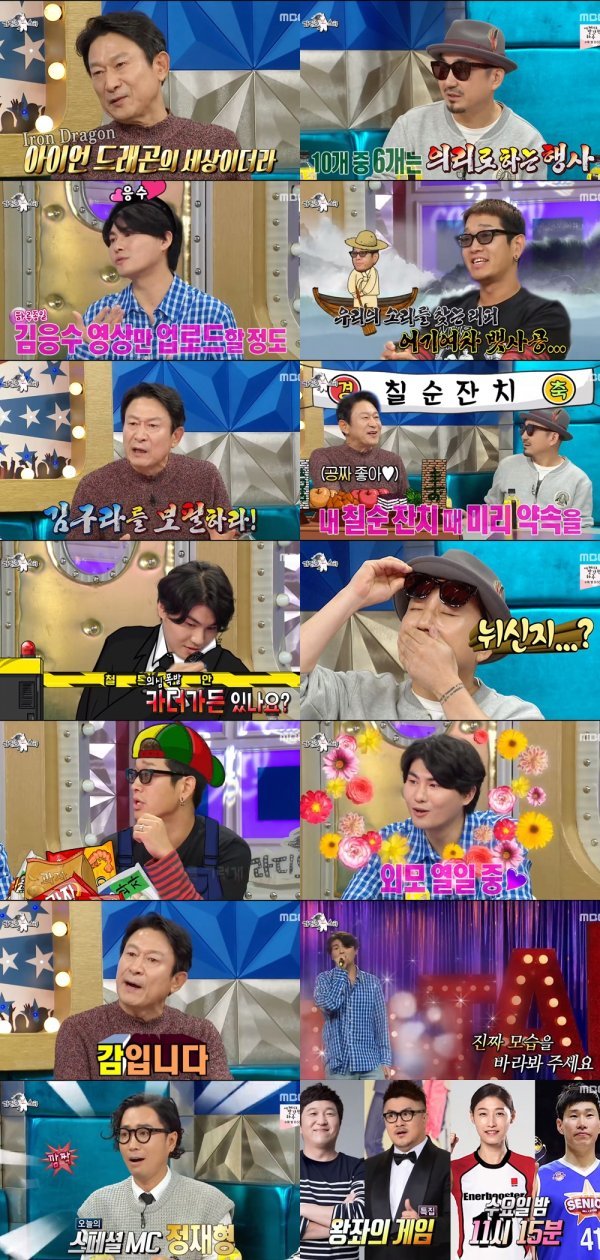 ‘타짜’ 곽철용 캐릭터로 강제 전성기를 맞은 배우 김응수가 ‘라디오스타’에 출연해 번뜩이는 예능감과 입담을 더블로 펼치며 수요일 밤을 장악했다. 이와 함께 껍데기에 대한 오해를 풀고 싶은 박상민, 카더가든, 뱃사공이 진솔한 모습으로 웃음을 더했다.