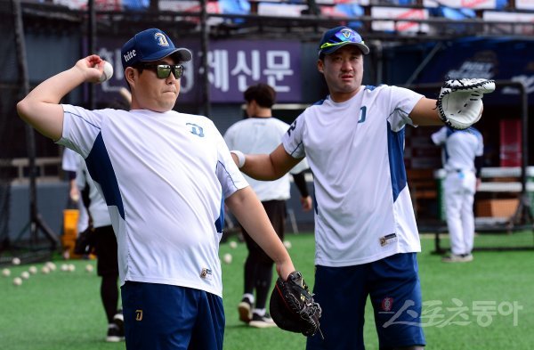 3일 서울 잠실야구장에서 ‘2019 신한은행 MY CAR KBO리그’ LG 트윈스와 NC 다이노스의 와일드카드 1차전 경기가 열린다. 경기 전 NC 양의지와 김태군이 훈련을 하고 있다.