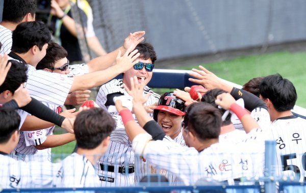 3일 서울 잠실야구장에서 ‘2019 신한은행 MY CAR KBO리그’ LG 트윈스와 NC 다이노스의 와일드카드 1차전 경기가 열렸다. 1회말 1사 2루에서 LG 이형종의 1타점 적시타 때 2루 주자 이천웅이 득점에 성공한 뒤 동료들의 환영을 받고 있다.