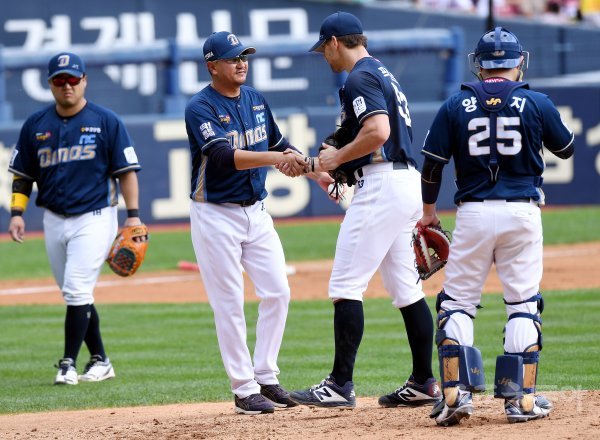 3일 서울 잠실야구장에서 ‘2019 신한은행 MY CAR KBO리그’ LG 트윈스와 NC 다이노스의 와일드카드 1차전 경기가 열렸다. 4회말 무사 1, 3루에서 NC 프리드릭이 교체되고 있다.