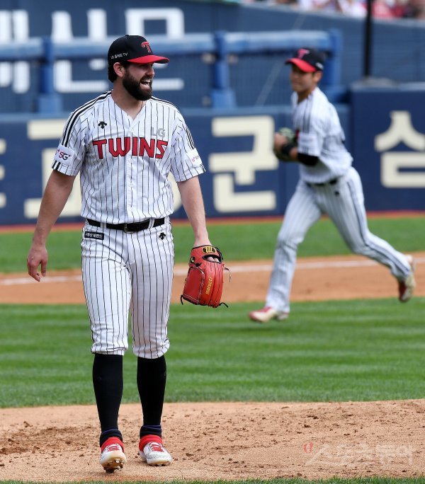 3일 서울 잠실야구장에서 ‘2019 신한은행 MY CAR KBO리그’ LG 트윈스와 NC 다이노스의 와일드카드 1차전 경기가 열렸다. 4회초 2사 1, 2루에서 NC 모창민을 아웃시킨 LG 선발 켈리가 미소를 짓고 있다.