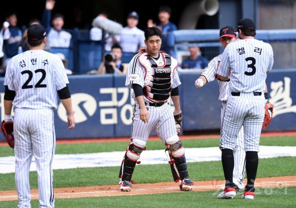 3일 서울 잠실야구장에서 ‘2019 신한은행 MY CAR KBO리그’ LG 트윈스와 NC 다이노스의 와일드카드 1차전 경기가 열렸다. 4회초 2사 1루에서 NC 스몰린스키의 플라이 타구를 LG 유강남이 잡지 못하며 실책하자 아쉬워하고 있다.