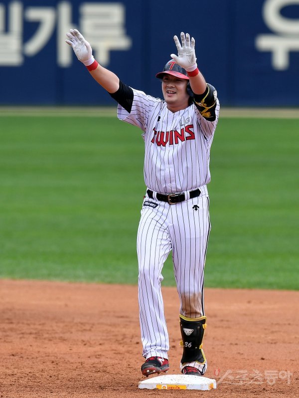 3일 서울 잠실야구장에서 ‘2019 신한은행 MY CAR KBO리그’ LG 트윈스와 NC 다이노스의 와일드카드 1차전 경기가 열렸다. 4회말 1사 2루에서 LG 이형종이 1타점 2루타를 날린 뒤 환호하고 있다.