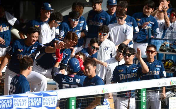 3일 서울 잠실야구장에서 ‘2019 신한은행 MY CAR KBO 포스트시즌’ LG 트윈스와 NC 다이노스의 와일드카드 결정전 1차전이 열렸다. 5회초 1사 NC 노진혁이 우월 솔로 홈런을 날리고 그라운드를 돌아 홈인해 하이파이브 하고 있다.