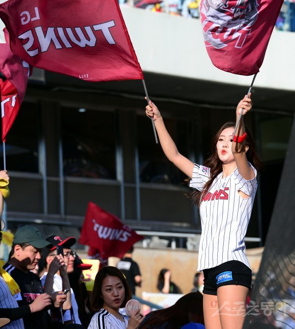 3일 서울 잠실야구장에서 ‘2019 신한은행 MY CAR KBO리그’ LG 트윈스와 NC 다이노스의 와일드카드 1차전 경기가 열렸다. LG 치어리더가 응원을 펼치고 있다.