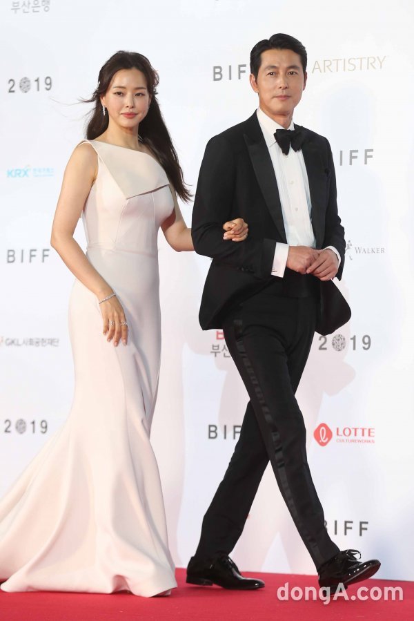 배우 이하늬와 정우성이 3일 오후 부산 해운대구 영화의 전당에서 열린 제24회 부산국제영화제 개막식 레드카펫 행사에 참석하고 있다.