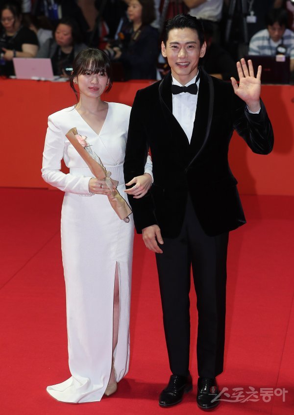배우 천우희와 유태오가 3일 부산 해운대구 영화의 전당에서 열린 ‘제24회 부산국제영화제(BIFF)’ 개막식에 참석해 레드카펫을 밟고 있다.