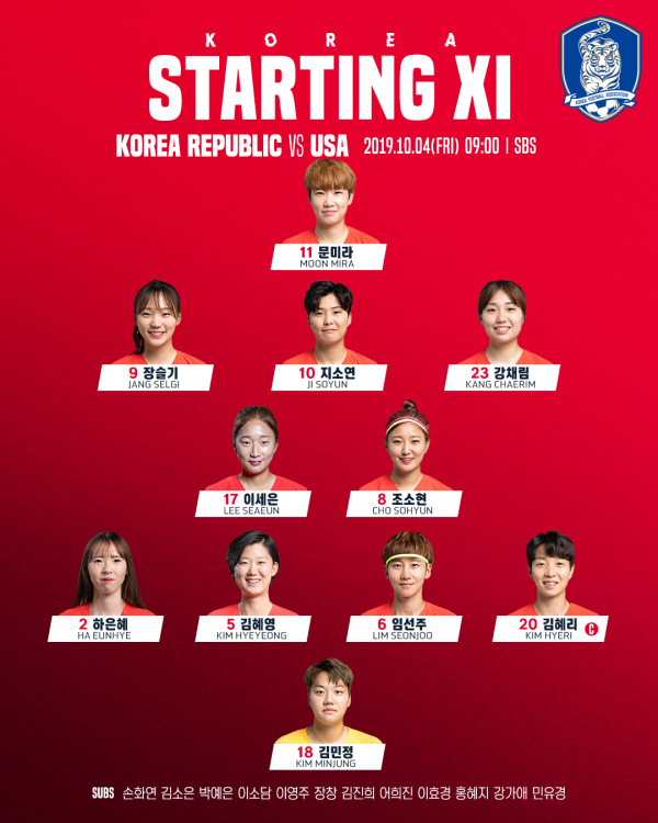 이날 한국은 4-2-3-1 포메이션으로 나선다. 최전방에 문미라(수원도시공사)가 위치하고 2선은 장슬기(인천현대제철), 지소연(첼시FC위민), 강채림(인천현대제철)이 받친다.