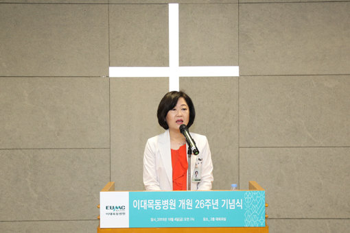 한종인 이대목동병원장이 이대목동병원 개원 26주년 기념식에서 기념사를 하고 있다. 사진제공|이대목동병원