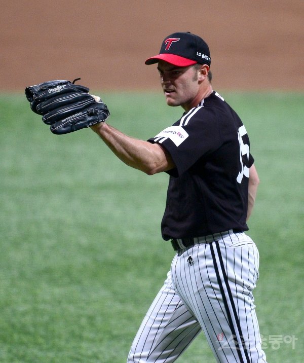 6일 서울 고척스카이돔에서 ‘2019 신한은행 MY CAR KBO 포스트시즌’ LG 트윈스와 키움 히어로즈의 준플레이오프 1차전이 열렸다. 선발 투수로 등판한 LG 윌슨이 2회말 2사 1,3루 상황에서 키움 타자를 내야 땅볼로 아웃시킨 후 포수를 향해 손짓하고 있다.