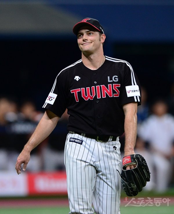 6일 서울 고척스카이돔에서 ‘2019 신한은행 MY CAR KBO 포스트시즌’ LG 트윈스와 키움 히어로즈의 경기가 열렸다. LG 선발 윌슨이 4회말 1사 1루에서 안타를 허용한 후 씁쓸한 미소를 짓고 있다.