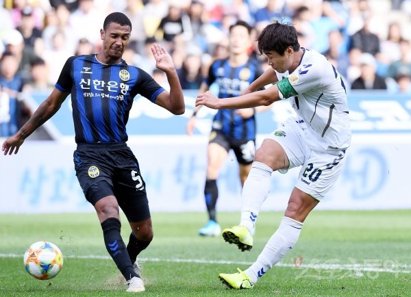 6일 인천 축구전용경기장에서 열린 ‘하나원큐 K리그1 2019’ 인천 유나이티드와 전북 현대의 경기에서 전북 이동국이 인천 수비수를 앞에 두고 슛을 날리고 있다.