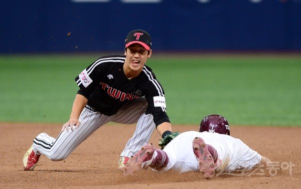 6일 서울 고척스카이돔에서 ‘2019 신한은행 MY CAR KBO 포스트시즌’ LG 트윈스와 키움 히어로즈의 경기가 열렸다. 키움 김하성이 5회말 2사 1루에서 2루 도루를 시도했으나 태그아웃 당하고 있다.