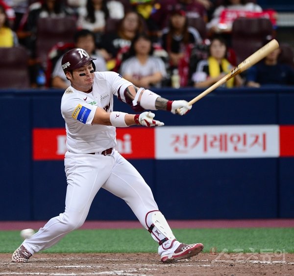 6일 서울 고척스카이돔에서 ‘2019 신한은행 MY CAR KBO 포스트시즌’ LG 트윈스와 키움 히어로즈의 경기가 열렸다. 키움 박병호가 6회말 1사 헛스윙 삼진을 당하고 있다.