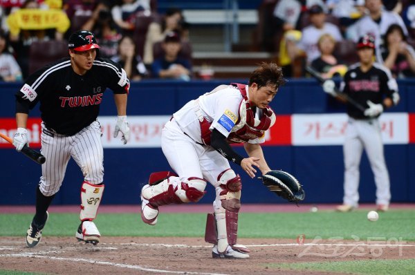 키움 포수 이지영이 8회초 무사 1루에서 LG 유강남의 희생번트를 잡기 위해 달려가고 있다.