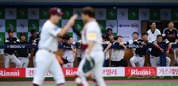 LG 덕아웃 선수들이 8회초 무사 1루에서 희생번트 실패로 병살타가 되자 아쉬워하고 있다.