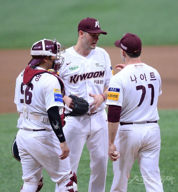 선발 투수로 등판한 키움 브리검이 7회초 1사 1,2루 상황에서 교체되고 있다.