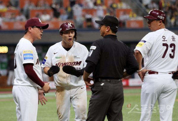 키움 김하성(가운데)이 8회말 1사 1루에서 견제사를 당한 후 장정석 감독(왼쪽)과 함께 1루심 박종철 심판에게 LG 선발 윌슨의 보크에 대해 강하게 어필하고 있다.
