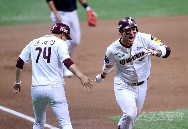 6일 서울 고척스카이돔에서 ‘2019 신한은행 MY CAR KBO 포스트시즌’ LG 트윈스와 키움 히어로즈의 준플레이오프 1차전이 열렸다. 9회말 무사 키움 박병호가 끝내기 중월 솔로 홈런을 날리고 그라운드를 돌며 환호하고 있다.