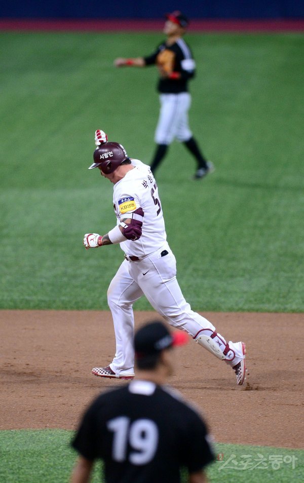 6일 서울 고척스카이돔에서 ‘2019 신한은행 MY CAR KBO 포스트시즌’ LG 트윈스와 키움 히어로즈의 준플레이오프 1차전이 열렸다. 9회말 무사 키움 박병호가 끝내기 중월 솔로 홈런을 날리고 그라운드를 돌며 환호하고 있다.
