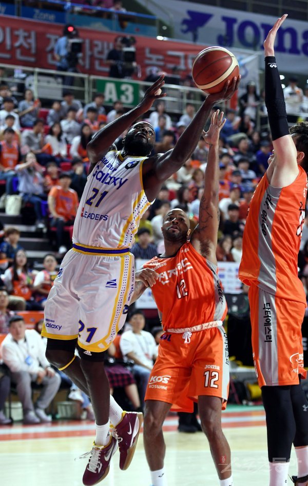 6일 인천삼산월드체육관에서 열린 ‘2019-2020 현대모비스 프로농구’ 인천 전자랜드와 서울 삼성의 경기에서 삼성 제임스가 전자랜드 강상재의 수비를 앞에 두고 슛을 쏘고 있다.
