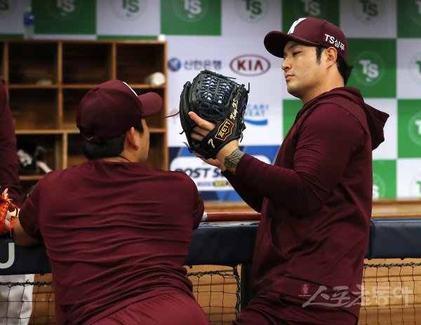 키움 경기 전 김하성의 글러브를 만져보고 있다.