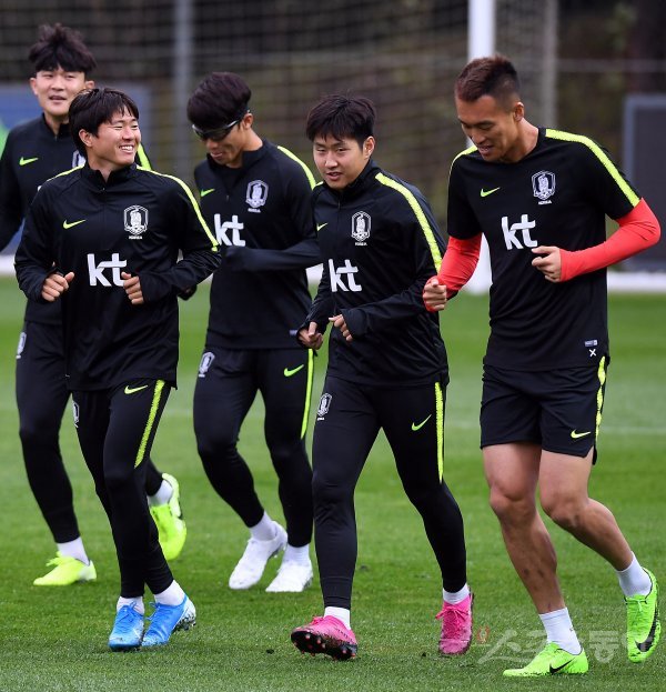 카타르월드컵 아시아 예선경기를 앞두고 한국축구대표팀이 7일 파주 축구국가대표트레이닝센터(NFC)에 소집됐다. 축구대표팀 권창훈이 이강인과 러닝 훈련을 하고 있다.