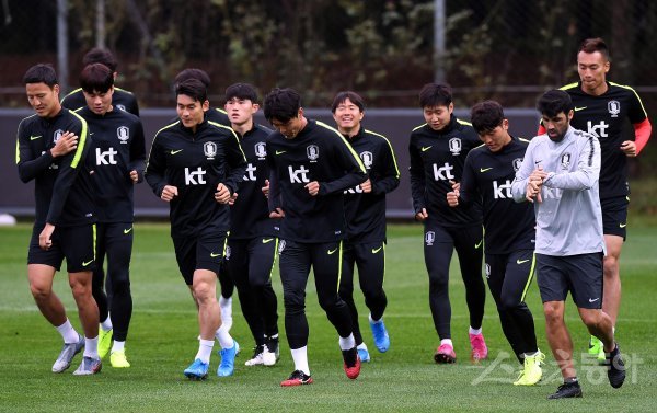 카타르월드컵 아시아 예선경기를 앞두고 한국축구대표팀이 7일 파주 축구국가대표트레이닝센터(NFC)에 소집됐다. 축구대표팀 선수들이 가볍게 달리며 훈련하고 있다.