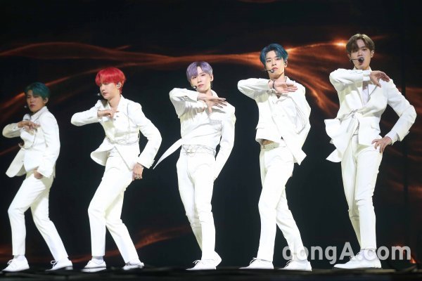 그룹 AB6IX(에이비식스)가 7일 오후 서울 동대문구 경희대학교 평화의 전당에서 열린 첫 정규 앨범 ‘6IXENSE(식스센스)’ 발매 쇼케이스에서 새로운 무대를 선보이고 있다.
