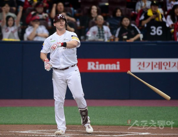 7일 서울 고척스카이돔에서 ‘2019 신한은행 MY CAR KBO 포스트시즌’ LG 트윈스와 키움 히어로즈의 경기가 열렸다. 키움 샌즈가 1회말 2사 헛스윙 삼진을 당한 후 배트를 던지고 있다.