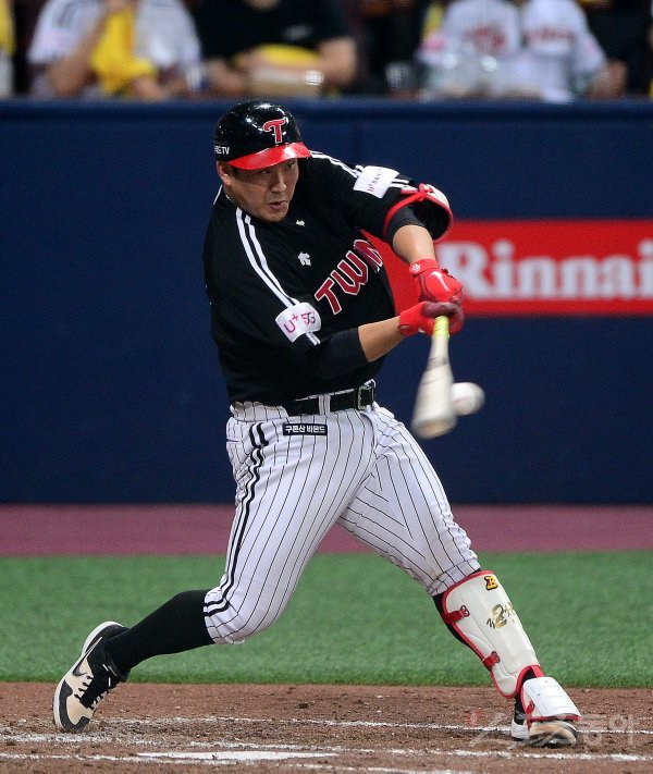 7일 서울 고척스카이돔에서 ‘2019 신한은행 MY CAR KBO 포스트시즌’ LG 트윈스와 키움 히어로즈의 경기가 열렸다. LG 유강남이 3회초 1사 1,2루에서 적시 2루타를 치고 있다.