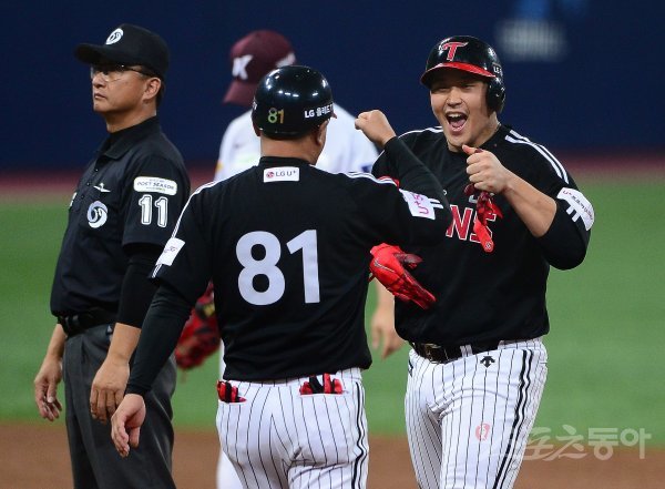 7일 서울 고척스카이돔에서 ‘2019 신한은행 MY CAR KBO 포스트시즌’ LG 트윈스와 키움 히어로즈의 경기가 열렸다. LG 유강남이 3회초 1사 1,2루에서 적시 2루타를 친 후 김호 코치와 하이파이브를 하고 있다.
