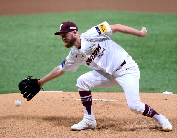 7일 서울 고척스카이돔에서 ‘2019 신한은행 MY CAR KBO 포스트시즌’ LG 트윈스와 키움 히어로즈의 준플레이오프 2차전이 열렸다. 선발 투수로 등판한 키움 요키시가 1회초 무사 LG 이천웅의 타구를 잡고 있다.