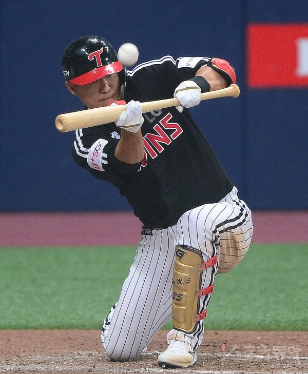7일 서울 고척스카이돔에서 ‘2019 신한은행 MY CAR KBO 포스트시즌’ LG 트윈스와 키움 히어로즈의 경기가 열렸다. LG 김민성이 4회초 무사 1루에서 번트를 실패하고 있다.