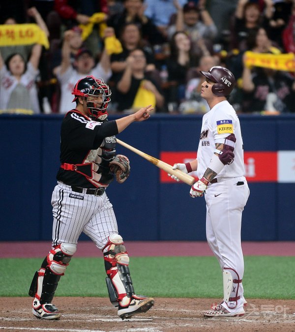 7일 서울 고척스카이돔에서 ‘2019 신한은행 MY CAR KBO 포스트시즌’ LG 트윈스와 키움 히어로즈의 경기가 열렸다. 키움 박병호가 6회말 1사 2,3루에서 삼진을 당한 후 아쉬워하고 있다.