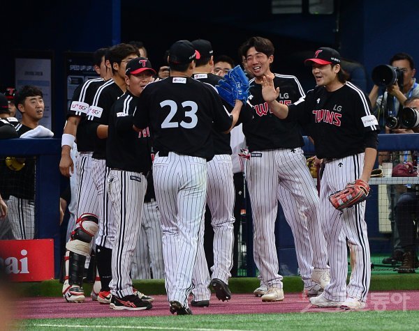 7일 서울 고척스카이돔에서 ‘2019 신한은행 MY CAR KBO 포스트시즌’ LG 트윈스와 키움 히어로즈의 경기가 열렸다. LG 선발 차우찬이 7회말 키움 공격을 무실점으로 막은 후 덕아웃에서 동료들의 축하를 받고 있다.