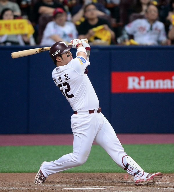 7일 서울 고척스카이돔에서 ‘2019 신한은행 MY CAR KBO 포스트시즌’ LG 트윈스와 키움 히어로즈의 경기가 열렸다. 키움 박병호가 8회말 1사 1루에서 투런 홈런을 치고 있다.