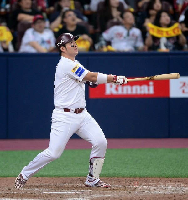 7일 서울 고척스카이돔에서 ‘2019 신한은행 MY CAR KBO 포스트시즌’ LG 트윈스와 키움 히어로즈의 경기가 열렸다. 키움 박병호가 8회말 1사 1루에서 투런 홈런을 치고 있다.