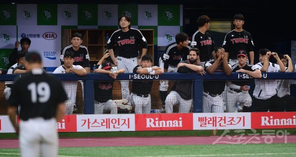 LG 덕아웃 선수들이 9회말 동점을 허용하자 굳은 표정으로 그라운드를 바라보고 있다.