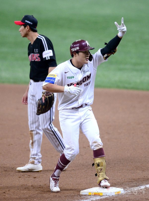 연장 10회말 무사 키움 김하성이 중전 안타를 치고 1루에서 환호하고 있다.