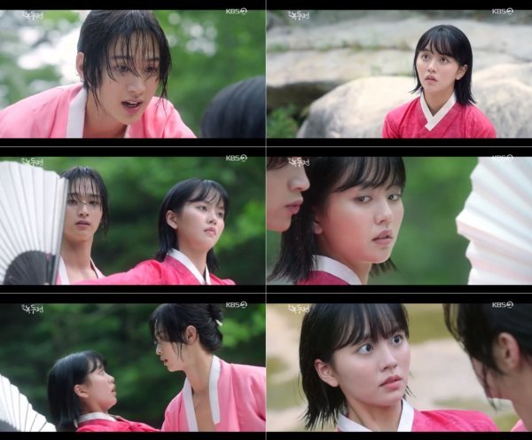 이날 무월단과 장작용 나무를 베러 갔다가 옷이 찢어진 전녹두. 정체가 발각될 위기에 처한 순간 동동주를 만났고 함께 도망쳤다. 그러다 계곡에 동반 입수한 두 사람. 이들은 무월단에 “더워서 목욕하고 있었다”고 둘러대며 위기를 모면했다.