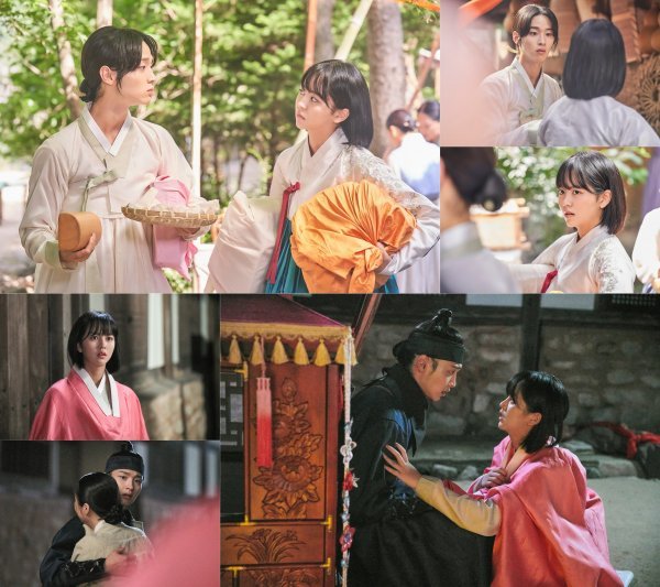 또 다른 사진에는 달콤 살벌했던 낮의 풍경과 사뭇 다른 두 사람이 담겼다. 검은색 무복을 차려입은 녹두는 낯선 여인을 품에 끌어안고 있는 모습. 그런 두 사람을 바라보는 동주의 흔들리는 눈빛과 당황한 표정이 역력한 녹두가 궁금증을 더한다. 이어진 사진 속 위험에 처한 듯한 녹두와 동주가 시선을 사로잡는다. 걱정 어린 눈빛을 나누는 녹두와 동주, 과연 이들에게 어떤 위기가 기다리고 있을지 궁금증을 높인다.