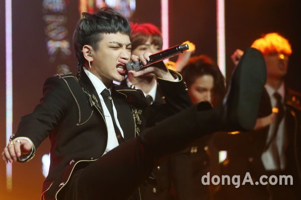 그룹 에이티즈의 홍중이 8일 오후 서울 강남구 일지아트홀에서 열린 첫 번째 정규앨범 \'TREASURE EP.FIN : All To Action\' 발매 쇼케이스에서 새로운 무대를 선보이고 있다.